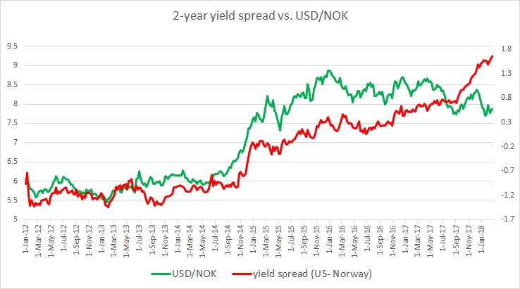 The chart above shows, how the relationship between USD/NOK and 2-year yield spread has unfolded since 2012.