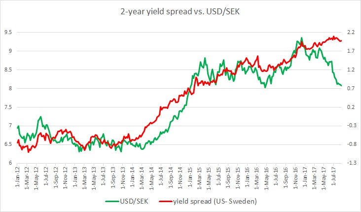 The chart above shows, how the relationship between USD/SEK and 2-year yield spread has unfolded since 2012.