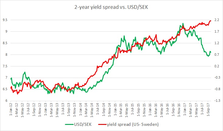 The chart above shows, how the relationship between USD/SEK and 2-year yield spread has unfolded since 2012.