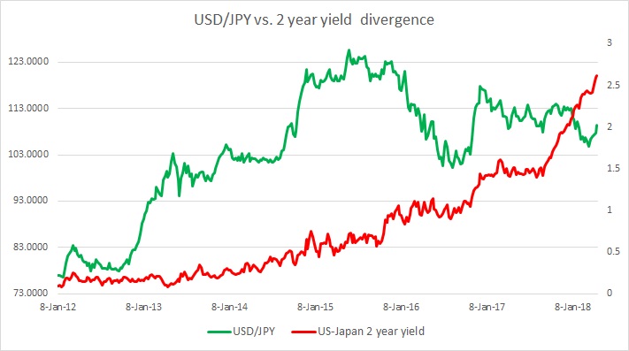- It had shown excellent response to the yield divergence in the past, especially after Bank of Japan (BoJ) announced its quantitative easing program back in 2012. The close relationship lasted till summer of 2015. US-Japan 2 year yield spread rose from 0.13 percent in 2012 to 0.72 percent by May 2015 and hovered there till October and the exchange rate reached from 76 to 126 in that same period.