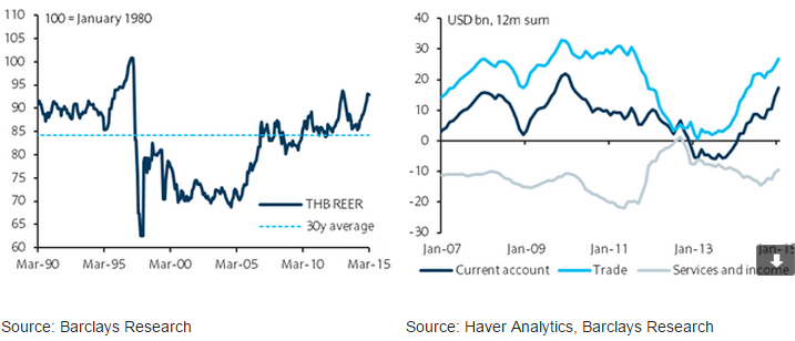 - We see a reduced risk of rate cuts by the BoT to counter THB strength in coming months, with future decisions on monetary policy likely to be based more on growth and inflation considerations. Given this, and considering the substantial improvement in Thailand's external balance this year (2015 current account forecast of 7.9% of GDP versus 3.8% in 2014), we think THB outperformance versus other Asian FX will likely extend when the USD appreciation trend resumes after the recent pause.
