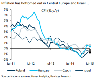 Inflation in Central Europe and Israel has risen off the lowest points, but remains well below targets. Given the recent declines in global commodity prices, the pattern in July is likely to be mixed and thus broadly unchanged, on average. Poland CPI inflation remains quite low at -0.8% y/y, as both food and energy are still in deflation. In addition, Poland's core inflation at just 0.2% y/y is the lowest in the region.