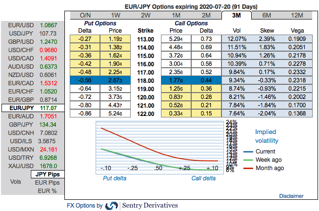 OTC Outlook: Most importantly, (at spot reference: 117.07 levels) the positively skewed EURJPY IVs of 3m tenors are signifying the bearish risks in the underlying spot (refer 1st exhibit). The bids for OTM puts indicates that the hedgers expect the underlying spot FX to show further dips so that OTM instruments would expire in-the-money (bids up to 113 levels).