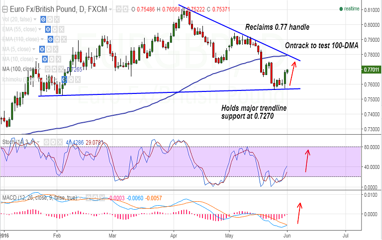 - EUR/GBP has bounced off major trendline support at 0.7570 and is attempting to reclaim the 0.77 handle.