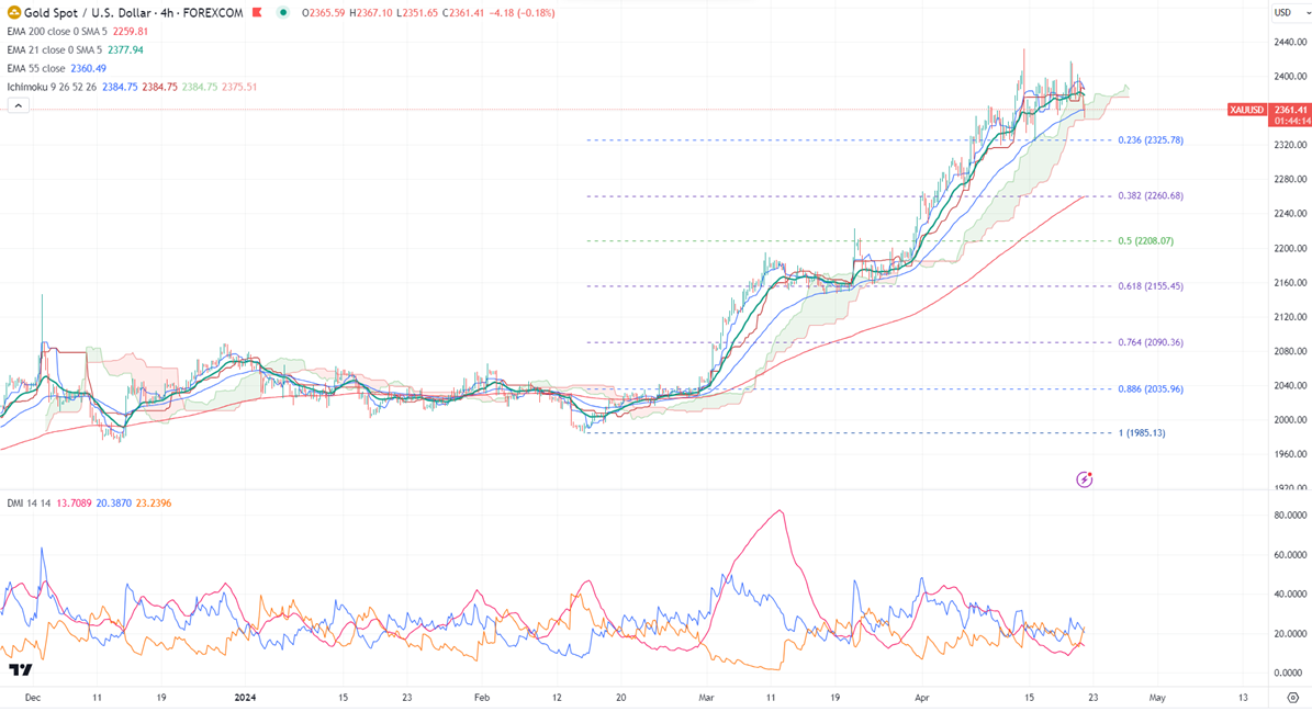 Gold trades weak after hawkish Fed remarks. It hit a low of $2351 at the time of writing and is currently trading around $2362.