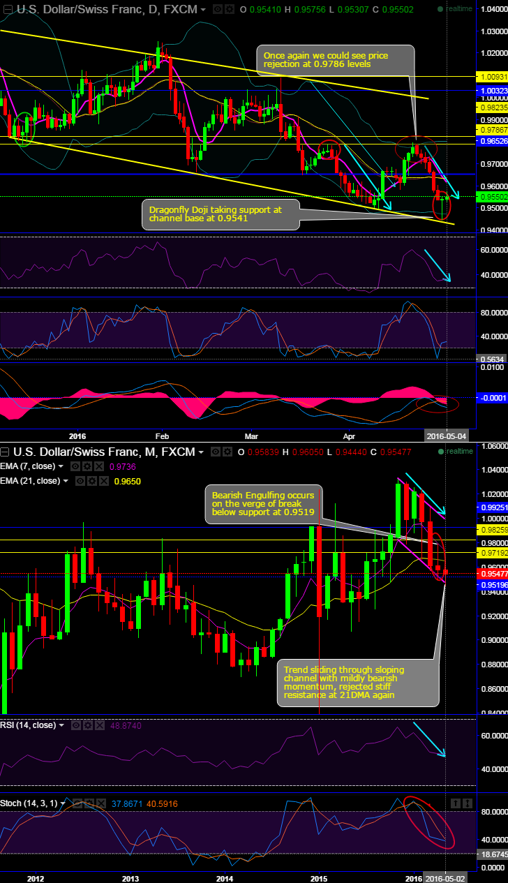 On daily charts, “Dragonfly Doji” taking support at channel base at 0.9541.