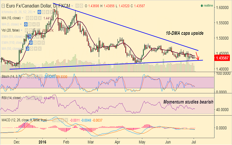 - EUR/CAD edges lower from session highs at 1.4385, 10-DMA (currently at 1.4411) weighs on the upside.