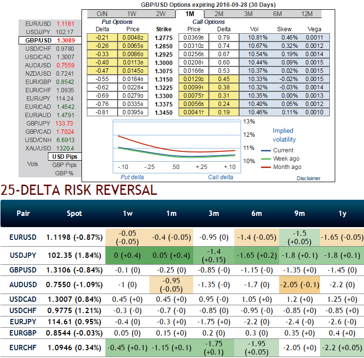 The above table ranks in rising implied volatility among G10 currency crosses, sterling overreacting due to upcoming economic events but likely to tumble and stabilize at 10.25% in the long run. IV and risk reversal readings of GBPUSD have been the best buys on for selecting an ATM put options.