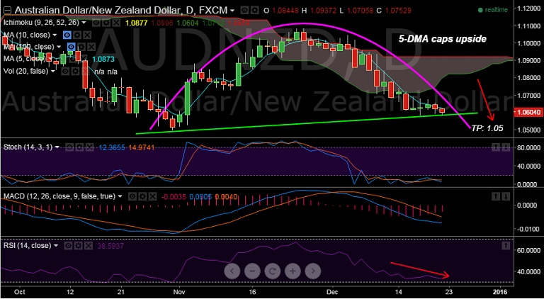 Inverted cup & handle pattern observed on AUD/NZD daily charts, price action is well below the cloud, RSI is at 33 and biased lower.