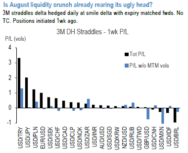 Summer liquidity can provide fertile ground for vol shocks. Prompted by low liquidity and by the sentiment taking leg lower last week, yen ripped through stop losses and has strengthened by nearly two big figures in matters of days. This week turn for EUR, EUR proxies and EMs for outsized spot moves. P/Ls from 3M delta-hedged straddles that are held for a week suggests that 80% of the USD/G10 & EM made money (refer 1st chart). But the looks can be deceiving. Stripping away the implied MTM component shows that realized vol notably performed for only 1/3ed of the currencies. The 80% count more closely reflects the market concerns rather than the actual events. That's not so surprising. After all the August liquidity crunch is real and the strong August seasonality as reflected e.g. in historical month start to month end changes in VXYGL tends to show August to be the month exhibiting vol bounce 75% of time during last two decades. Again, the details uncover a less dire backdrop. Those vol bounces have been historically vol supportive but modest in magnitude (2nd chart exhibits the distribution of vol changes is fairly tight). While the last two weeks have certainly seen some notable spot gyrations our view is that FX vols are priced fairly for such backdrop and suggest keeping a status quo absent a major adverse development. The modestly short vol leaning portfolio has seen some drawdowns particularly on the yen vol ratio spread trade amid MTM on the wider riskies which was partially offset by our defensive CNH fwd vol position. For now, we remain skeptical that the spot will genuinely deliver on yen skew. Amid the marginally more cautious backdrop below we review some limited downside and RV opportunities. Courtesy: JPM
