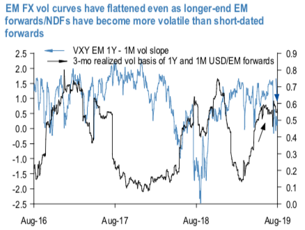 The cheapness of EM FX vol is especially pronounced in longer expiries (1Y) given the flatness of EMFX vol curves. The 1Y – 1M VXY EM vol curve is currently almost flat, which has typically not proved a sustainable state of affairs: either curves have to invert at higher vol levels amid FX stress, or markets drift into a pocket of calm that pulls the front-end lower and steepens term structures. We judge that the former is more likely in coming months, in part because of initial conditions on valuations as outlined earlier, and partly because long-end vols and vol curves have not priced in the accelerated de-coupling of US Treasury yields and the US dollar recently. While US rates and USD have been diverging all year, their moves have taken on urgency in August with the curve inversion-led cliff edge in 10Y yields (-40bp MTD) and an equally sharp coincidental surge in the greenback (JBDNUSD +1.8% MTD). USD vs. US rate de-correlation has long been recognized by options investors as bullish for vol. The intuition is that a lower UST yields lead to a mechanical widening of USD/EM (and indeed all USD/FX) forward points; longer the tenor, more pronounced this effect since forward points scale linearly in time-to-expiry. When accompanied by strength in spot USD FX, this exacerbates moves in forwards, and it is the volatility of the latter that underlies option pricing. The realized volatility differential between spot and 1Y forwards across USD/EM has climbed sharply of late and is approaching distress highs of 2016 and 2018, even as EM vol curves have flattened (refer above chart). Courtesy: JPM & Commerzbank