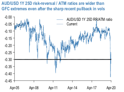 We have long held the view that AUD vols and skews have lost their ability to erupt explosively like they did during the GFC, so the price action in AUD options in Q1 came as a shock. The downbeat view on AUD’s reduced risk beta is informed by the changing structure of the Australian economy with the petering out of the China-led commodity boom, the attendant RBA rate cuts to cushion its economic impact and the drop-off in carry-seeking flows that left little by way of one-sided length (indeed speculative positioning has been short AUD for much of the past two years, basis CFTC data) at risk of a deleveraging rout – hence, our surprise at the speed and scale of the AUD rout in March. Structural arguments for AUD’s dampened risk- beta could not have changed in a month of course, but aside from option markets offering enormously better levels for re-selling AUD options, the raft of DM policy interventions that have likely curbed the worst tail outcomes, and a significant build-up in USD longs that may slow the speed of additional gains, we also take comfort from the shifting contours of the in-house JPM view around AUD which has turned less bearish in recent weeks as RBA QE begins to look distinctly lighter than elsewhere in G10-FX-bloc.
