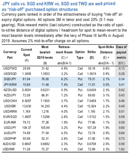 USDTWD calls screen as the best value in the region, but our preference is for JPY calls vs. SGD and KRW that have an established track record in stressed markets.