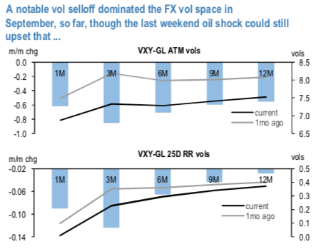 Amid the vol sell-off, delta-hedged straddles broadly succumbed (refer 2nd chart), but it is the breath of the long gamma MTD suffering that gives one a pause. Septembers seasonally tend to be one of the softest vol months and the current September proved that point. That said, the oil shock over the weekend still has potential to upset that bearish September FX vol stance even though the FX spot and vol reaction so far has been fairly contained.