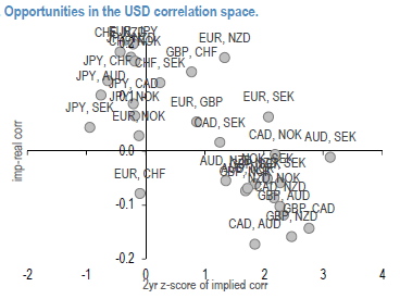 we investigate further the relationship above with the goal of identifying long correlation trades that can receive substantial discounts when positioning for spot moves on the “risk-on” side of the riskies. A proxy of implied realized 3m USD-correlations (refer 1st chart), as obtained via ATM volatilities, does not currently point to any obvious “cheap” correlation opportunity, as cases with historically low implied levels trade at a premium vs. historical ones (and vice-versa).