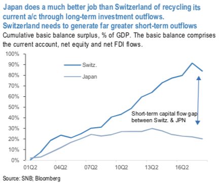 The bottom line is that Japan neutralises all of its current account surplus through outflows of long-term equity & FDI whereas Switzerland recycles only one-half in this manner (refer above chart).