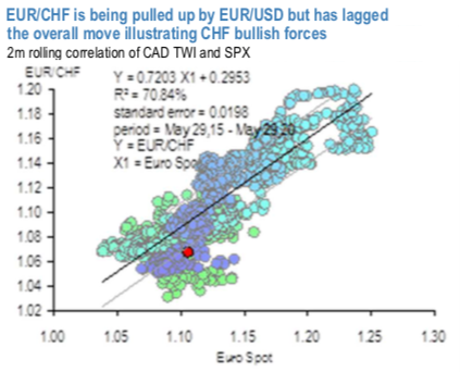 The 1st diagram shows that 1) EURCHF is being pulled higher by EURUSD; but 2) in level terms EURCHF is lower than would be warranted by the level of EURUSD, demonstrating the bullish CHF dimension to the trade. As a result, we keep exposure to this trade.