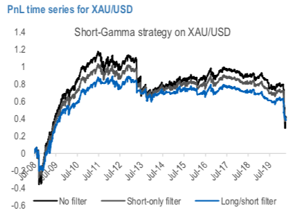 For XAUUSD (refer 1st chart), the filtering tool managed to cut by 50% the 50% drawdown experienced by the strategy as spot dropped by 12% and short-dated vol quadrupled in just a few weeks, as market bottomed around the 20th of March. The filtering analysis would recommend re-entering short- Gamma trades at the moment, but the intensity of the signal is still very weak. A possible takeaway from the filter analysis would be that of waiting until market conditions / price action stabilize further before considering playing for a tightening of front-dated vol, which remains 14 vol points higher than early February levels.