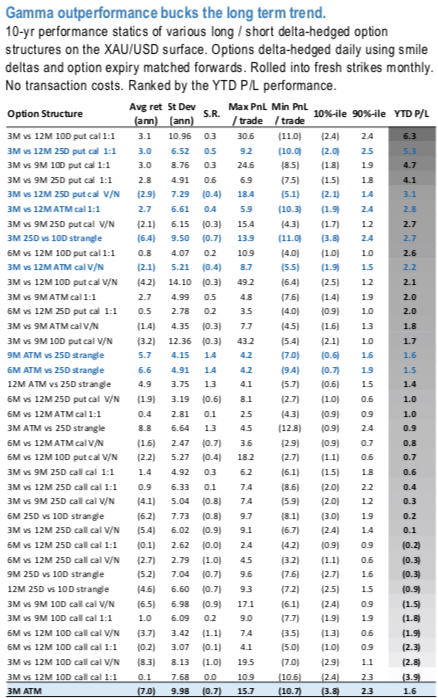 The above nutshell displays long-term and YTD performance of various calendar and vol spread structures. Long term performance favors irrespective of tenor vega neutral long straddles vs short strangles at impressive 1.3-1.4 Sharpe. Vega neutral short front vs long back tenor OTM call vol calendars perform only marginally worse. YTD 9M straddle vs 25D strangle vol spread and short 3M vs long 12M 10D call vol calendar posted 1.6vols and 2.8vols returns, respectively. While appealing, those returns are quite modest relative to their long term performance.