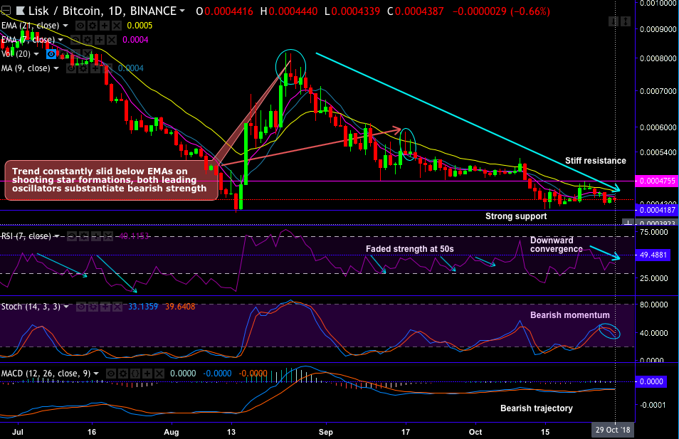 The current LSKBTC downtrend has been more imminent, the pair has constantly been sliding below EMAs ever since the formations of shooting star pattern candlestick, while both leading oscillators substantiate the bearish strength.