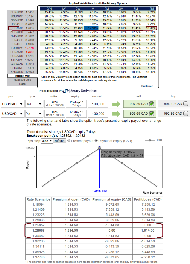 USDCAD spot FX is trading at 1.2838. IVs of 1W ATM contracts are at 13.57% and 12.10% for 1M tenors.