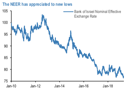 However, with the nominal effective exchange rate appreciating to record lows (refer 1st chart), the BoI has seemingly changed their rhetoric in the latest MPC minutes: "if the appreciation continues, the Bank of Israel will consider using the tool of intervention in the foreign exchange market". This indicates that any further shekel appreciation will likely be contained by a more proactive FX intervention policy.