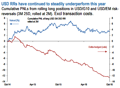 USD strengthening vs high beta currencies has tended to happen in a low vol regime, outside a few isolated exceptions (for instance: Aug 2015 CNY devaluation, Q4 2014 Oil collapse and impact on RUB, and recently Aug-Sep MXN sell-off on US Election risk), and selling USD skews has been a consistent alpha generation strategy over the past two years.