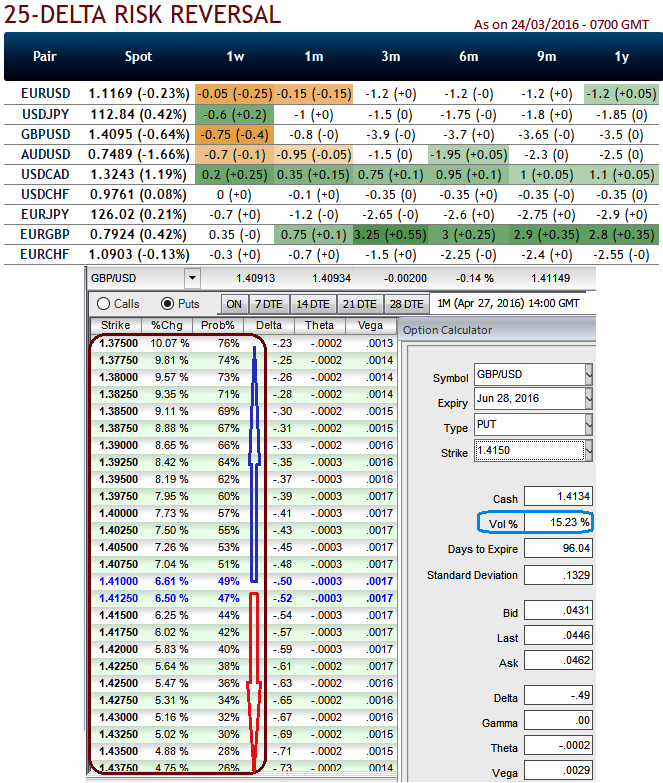 3M IV is trading at 15.23%, which is highest level in last 70 months, IV touched 16.9% in May 2010, when Prime Minister Cameron was suffering coalition issues post-election. With the adjustment to the IVs, risk reversals and next significant event that can have the major impact on GBPUSD would be UK referendum (that is scheduled 2 months from now).