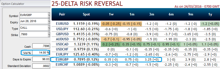 With the adjustment to the IVs, risk reversals and next significant event that can have the major impact on EURGBP would be UK referendum (that is scheduled 2 months from now), 3M IVs of EURGBP are still conducive for call option holders contemplating risk reversals.