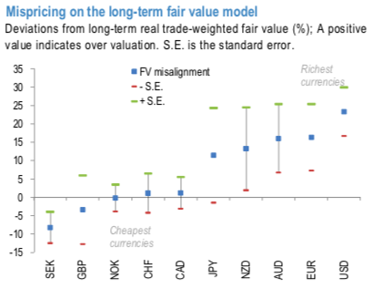 The ranking is relatively unchanged on the rich end of the spectrum, with USD, EUR and the Antipodean FX still featuring on that list. Among the funding currencies, CHF is the only one near fair value, with USD the richest, followed by EUR and JPY. Yet, None of these valuations are at an extreme indicating that movement in either direction is possible.