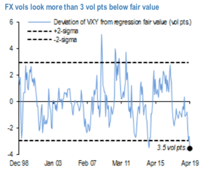Despite the rebound as occurred during the last week of April, FX vols remain near historical lows. Current volatility levels appear more than 2 std.devtn. undervalued based on the J.P. Morgan cyclical fair value for FX vols (refer above chart). In this market characterized by ultra-depressed volatility levels, the strategic appeal of holding long-optionality positions clashes with the multi-month trend dragging vols even lower, thus impacting long positions via time decay.
