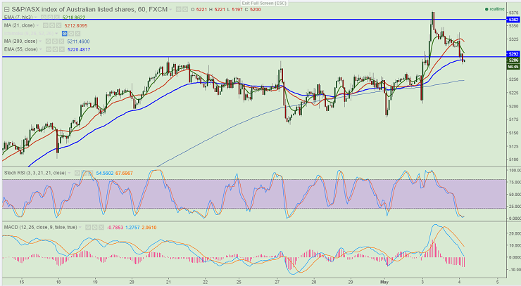 - ASX200 pares early gains yesterday and declined till 5278 at the time of writing. It is currently trading at 5278.