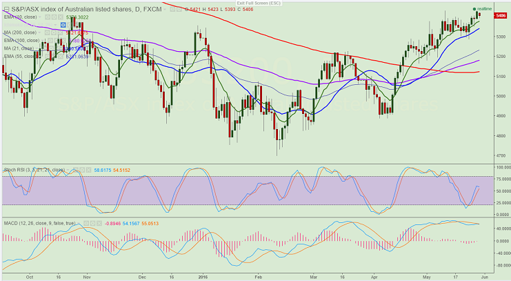 - ASX200 has slightly retreated after making a high of 5431 on Friday. It is currently trading at 5404.
