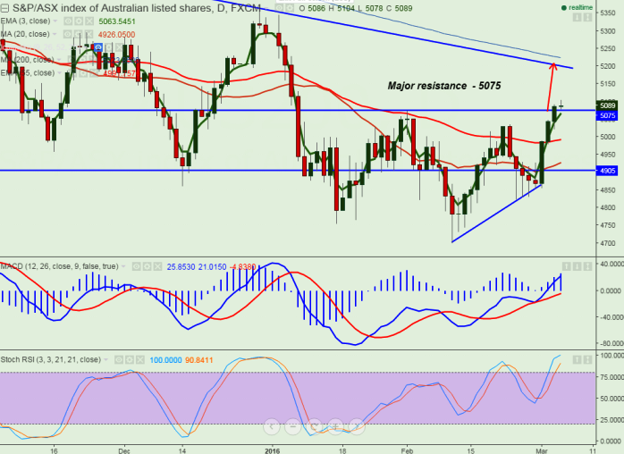 - ASX200 breaks major resistance 5075 and jumped till 5105. It is currently trading around 5088.