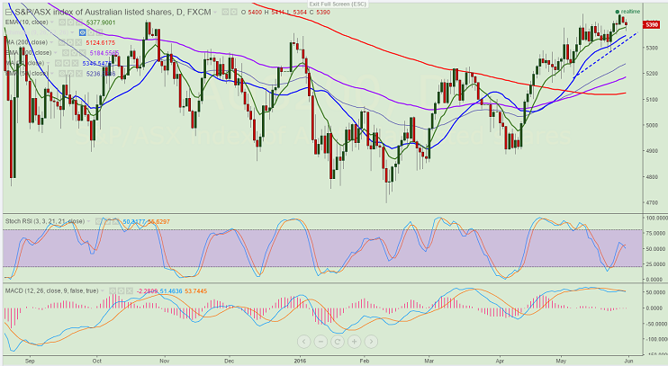 - ASX200 has slightly retreated after making a high of 5411. It is currently trading at 5387.