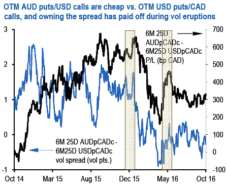 Alternatively, relative value constructs involving buying AUD puts/CAD calls vs. selling USD puts/CAD calls (live, no delta-hedge) appeal as low cost ways of assuming exposure to the same directional dynamic.
