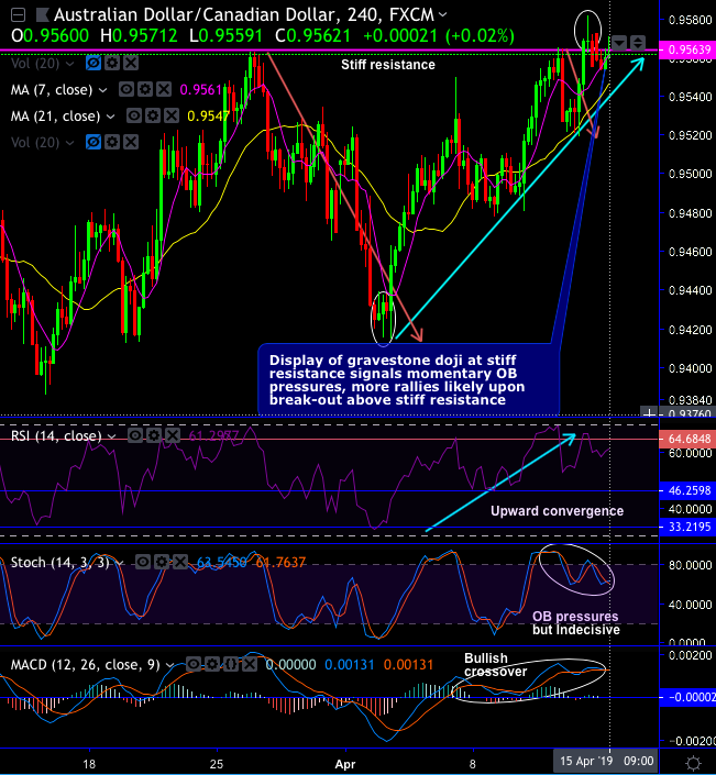 The display of AUDUSD’s gravestone doji has been signaling the exhaustiveness of the previous bullish swings. The stiff resistance is observed at 0.9563 levels.