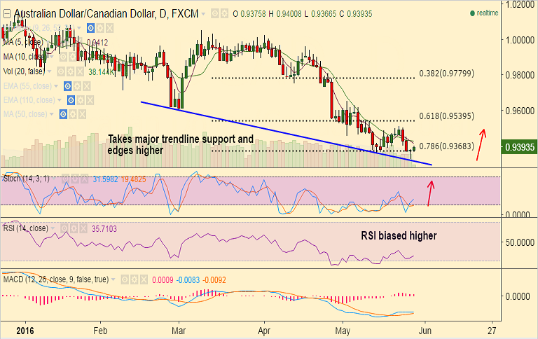- On the daily charts, AUD/CAD has bounced off major trendline support at 0.9320 and edged higher.