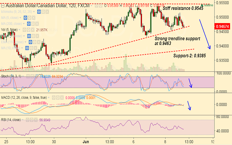 - AUD/CAD is holding above strong trendline support currently at 0.9463. Break below needed for further downside.