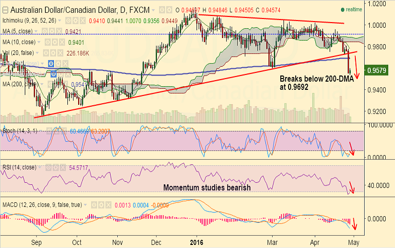 - AUD/CAD slump post dismal Australia's CPI data on Wednesday saw the pair break below strong 200-DMA support at 0.9692.