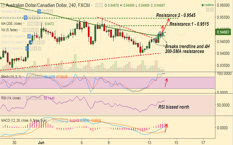 - On the 4 hourly chart, the pair has broken major resistances at 0.9455 (trendline) and 200-SMA at 0.9473.