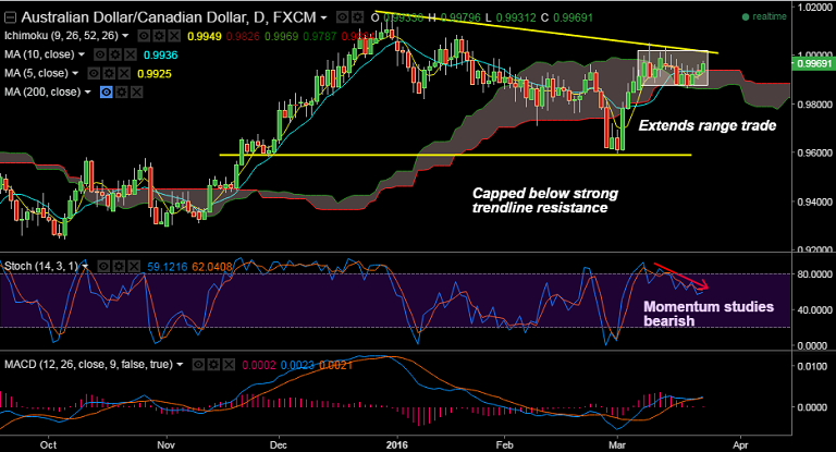 FxWirePro: AUD/CAD extending sideways trade below strong trendline resistance at 1.0012