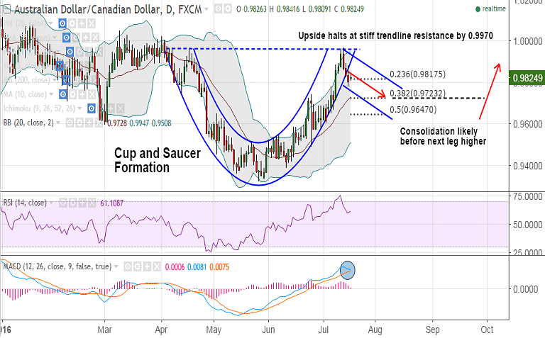 - The pair now finds support on the downside at 0.9817 (23.6% Fib of 0.9324 to 0.9970 rally). Break below will see next support at 0.9723 (38.2% Fib).