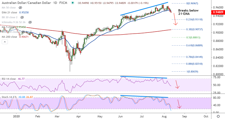 Resistance levels - 0.9526 (21-EMA), 0.9641 (Upper BB), 0.9696 (July 31 high)