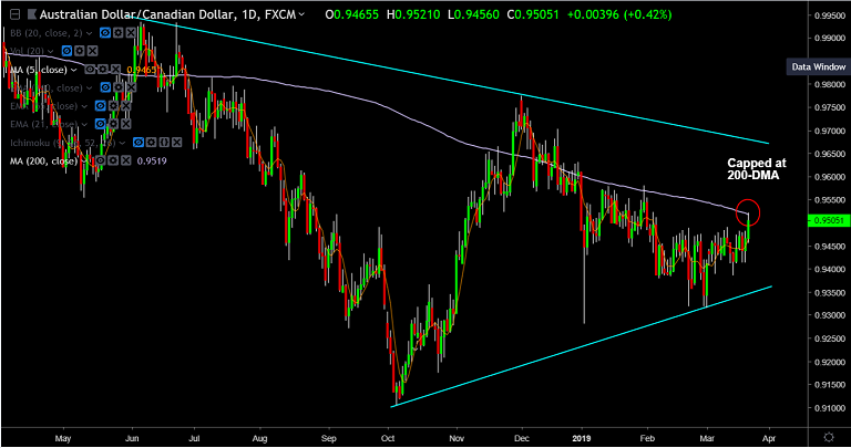- The pair is capped at 200-DMA which is major reistance at 0.9519.