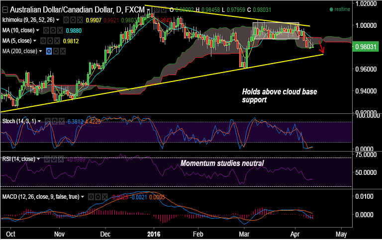 - Downside in the pair has found support by cloud base at 0.9799, breaks below will find next support at 0.9715 (rising trendline).