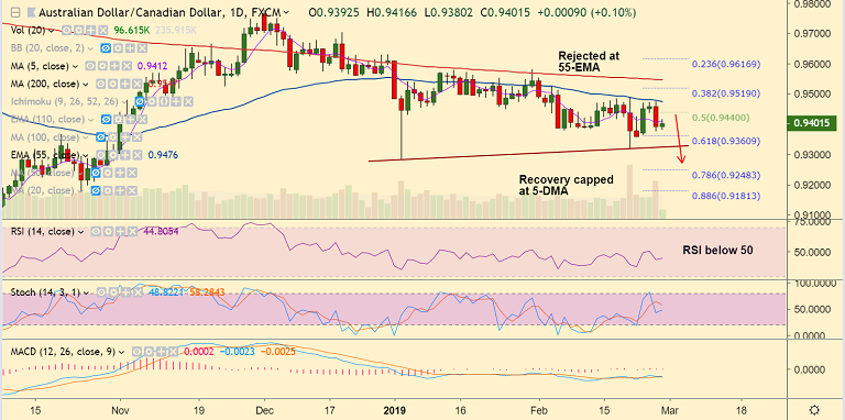 - AUD/CAD is trading around 0.94 at 0925 GMT, up 0.09% at the time of writing.