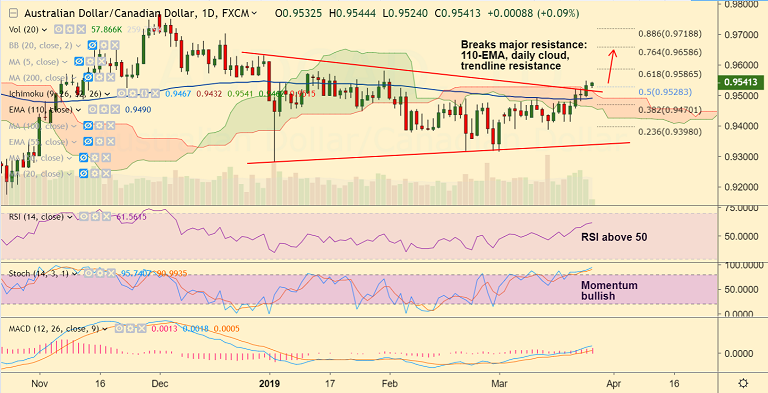 - The pair has broken out of daily cloud and major trendline resistance at 0.9515.