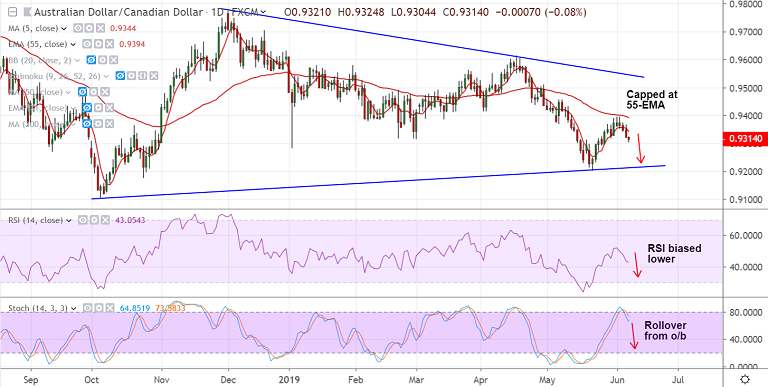 AUD/CAD is extending weakness for the 4th straight session, upside capped below 55-EMA.