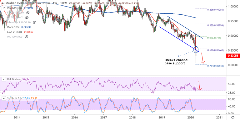 Price action has broken channel base support on the weekly charts and momentum strongly with the bears.